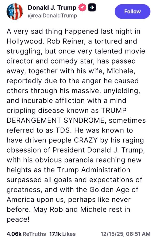 Following the tragedy, President Donald Trump addressed the deaths in a Truth Social post that immediately sparked backlash, even among many of his own supporters. In the post, Trump wrote: “A very sad thing happened last night in Hollywood. Rob Reiner, a tortured and struggling, but once very talented movie director and comedy star, has passed away, together with his wife, Michele, reportedly due to the anger he caused others through his massive, unyielding, and incurable affliction with a mind crippling disease known as TRUMP DERANGEMENT SYNDROME… He was known to have driven people CRAZY by his raging obsession of President Donald J. Trump… May Rob and Michele rest in peace!” While acknowledging the loss, the language — particularly the reference to “Trump Derangement Syndrome” — was widely criticized as inappropriate and cruel given the violent nature of the deaths. Notably, several longtime Trump supporters publicly condemned the post, calling it “disgusting,” “unnecessary,” and “lacking basic human decency,” while emphasizing that their criticism did not diminish their support for the President. Across political lines, many argued that moments of profound grief demand restraint, compassion, and respect — values that transcend ideology.